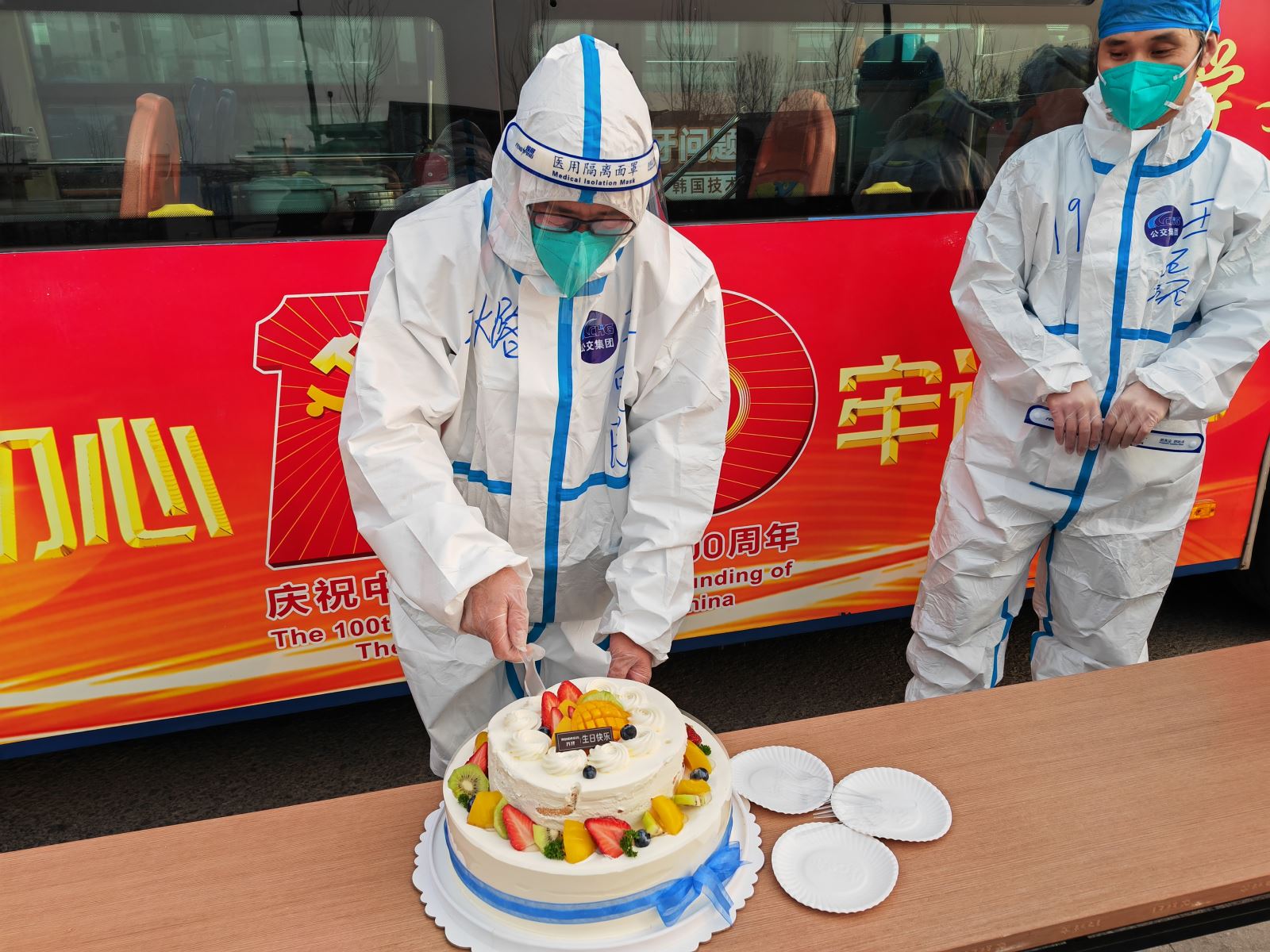3月24日下午,一條在財校場站集合任務的信息發(fā)送到了公交事業(yè)一部疫情隔離人員返家轉運組成員的手機中。大家紛紛趕來,遠遠看到一個精美的生日蛋糕出現在眼前。