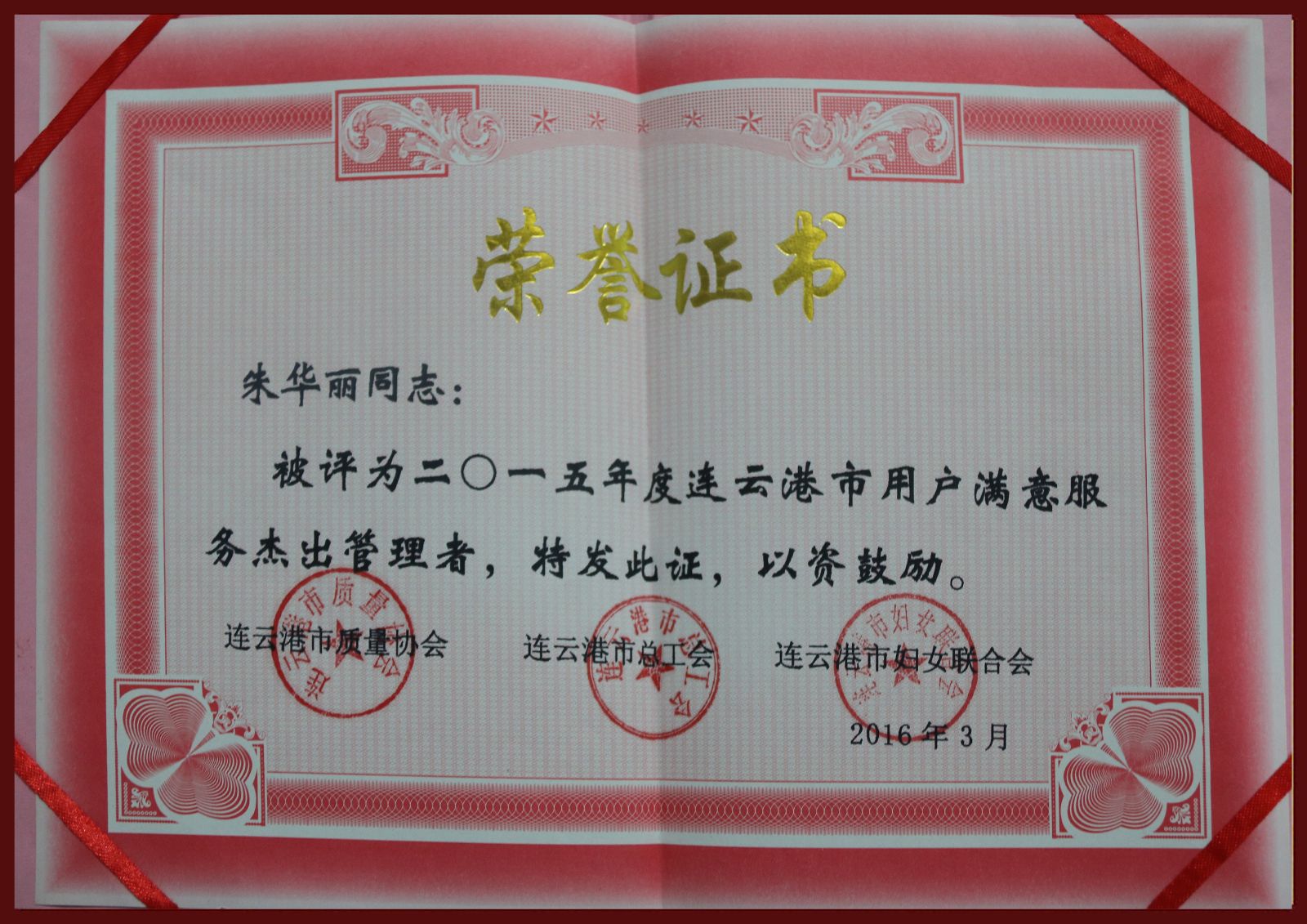 公交新浦公司朱華麗同志榮獲“2015年連云港市用戶滿意服務(wù)杰出管理者”稱號(hào)